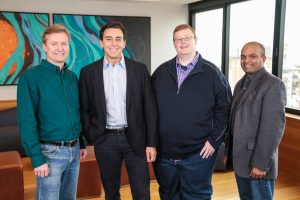 Ford is investing $1 billion during the next five years in Argo AI, combining Ford’s autonomous vehicle development expertise with Argo AI’s robotics experience and startup speed on artificial intelligence software – all to further advance autonomous vehicles. Pictured are: Peter Rander, Argo AI COO; Mark Fields, Ford president and CEO; Bryan Salesky, Argo AI CEO; and Raj Nair, Ford executive vice president, Product Development, and chief technical officer. Salesky and Rander are alumni of Carnegie Mellon National Robotics Engineering Center and former leaders on the self-driving car teams of Google and Uber, respectively.